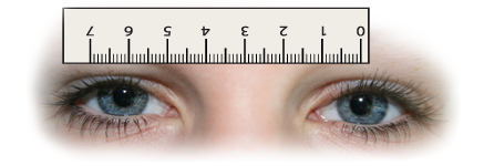 2. The ruler is held against the forehead as shown above. The person having the PD measured looks into the open eye of the person taking the measurement. The “0” is lined up with the centre of one pupil. Record the number lining up with the centre of the other pupil in millimetres.